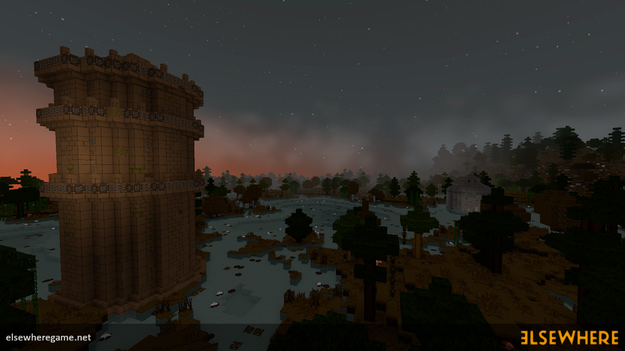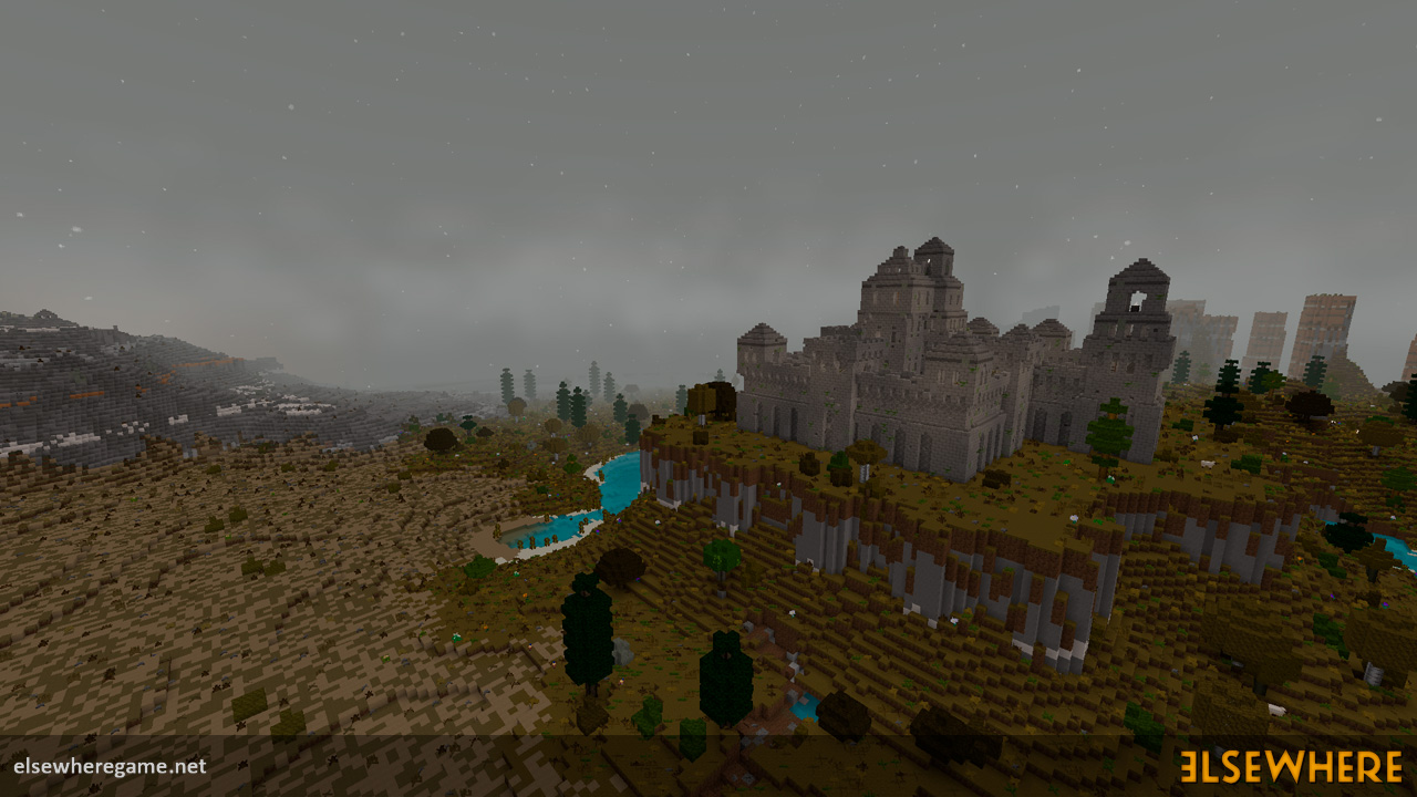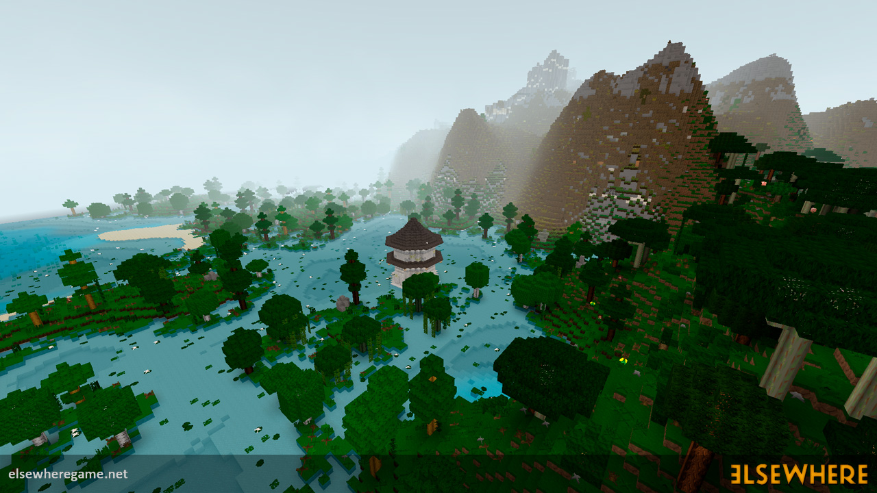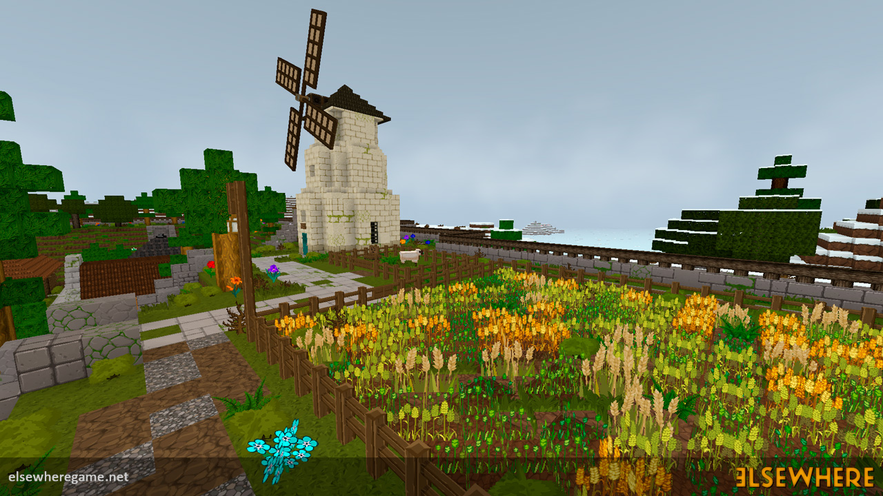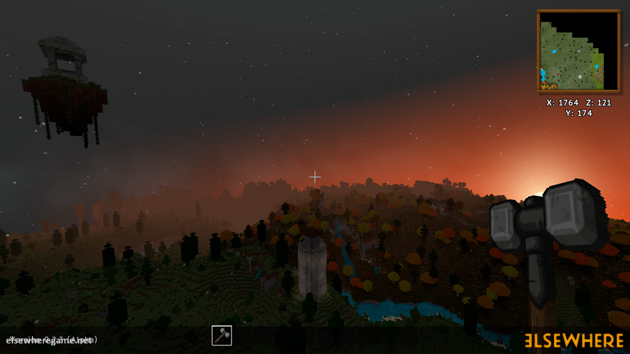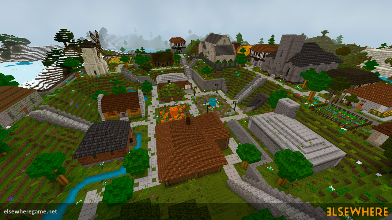 Elsewhere features a large procedurally generated and fully interactive world with dozens of biomes. Players can explore the world, place and remove blocks, build castles and machines, gather and process resources, farm, gather, and cook food, explore ancient ruins and temples, fight monsters, avoid traps, collect loot, and do many other things. There are over 8000 blocks, over 6500 recipes, and over 300 quests.