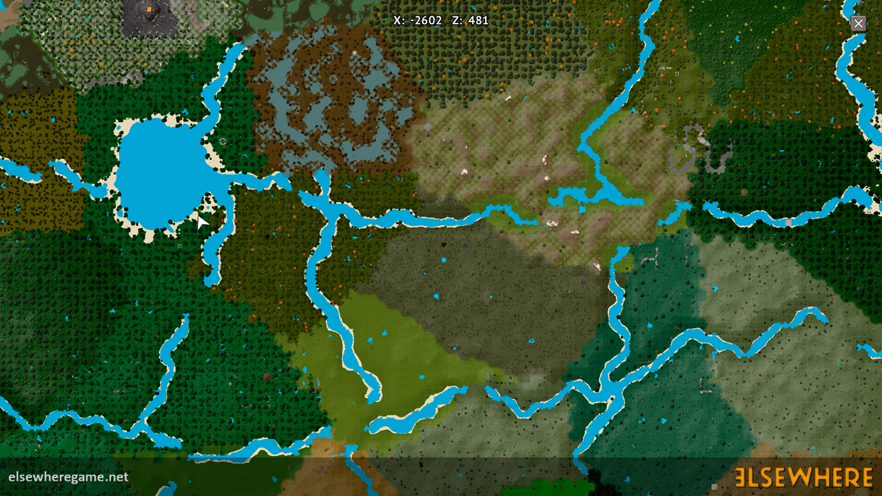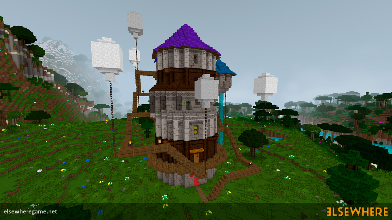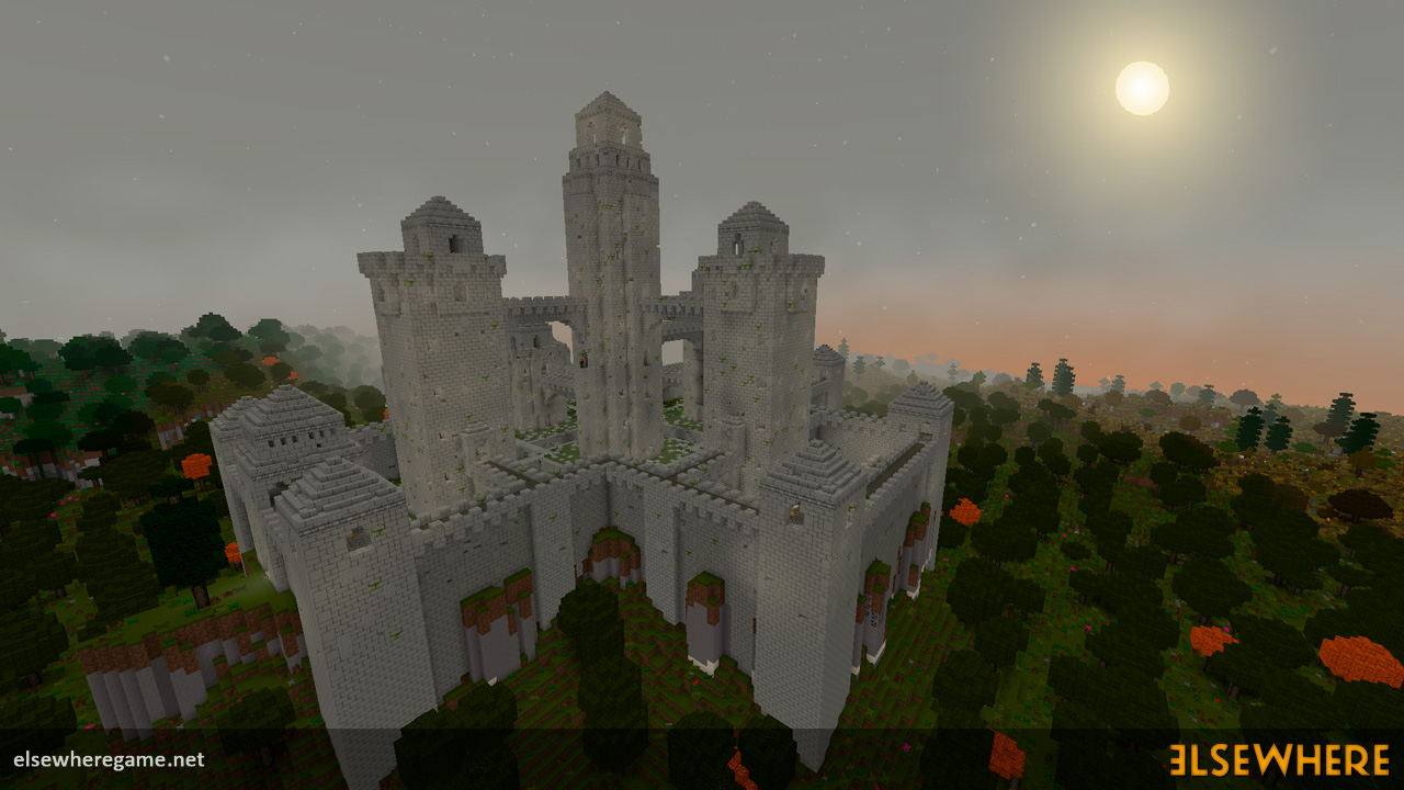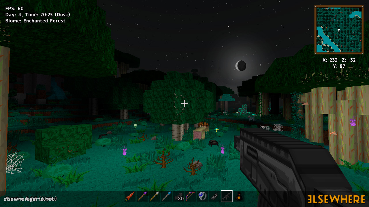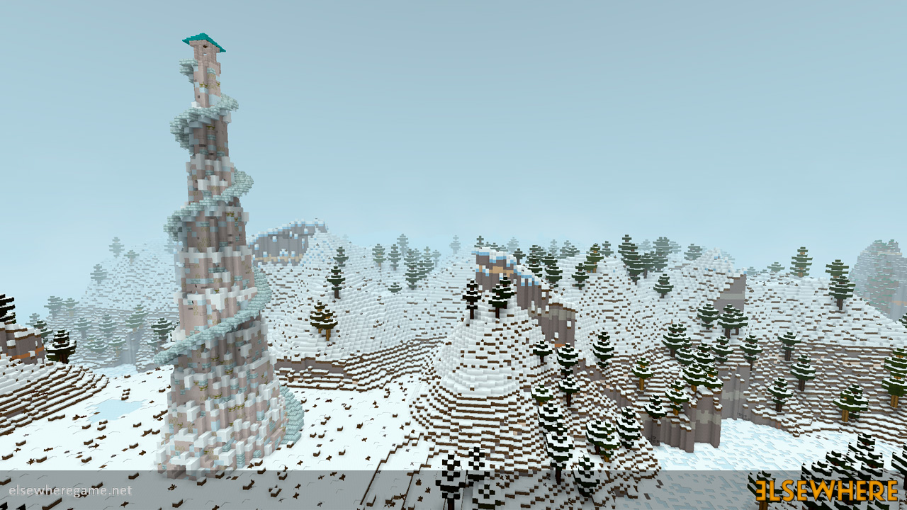 Elsewhere features a large procedurally generated and fully interactive world with dozens of biomes. Players can explore the world, place and remove blocks, build castles and machines, gather and process resources, farm, gather, and cook food, explore ancient ruins and temples, fight monsters, avoid traps, collect loot, and do many other things. There are over 8000 blocks, over 6500 recipes, and over 300 quests.