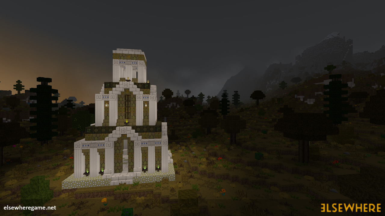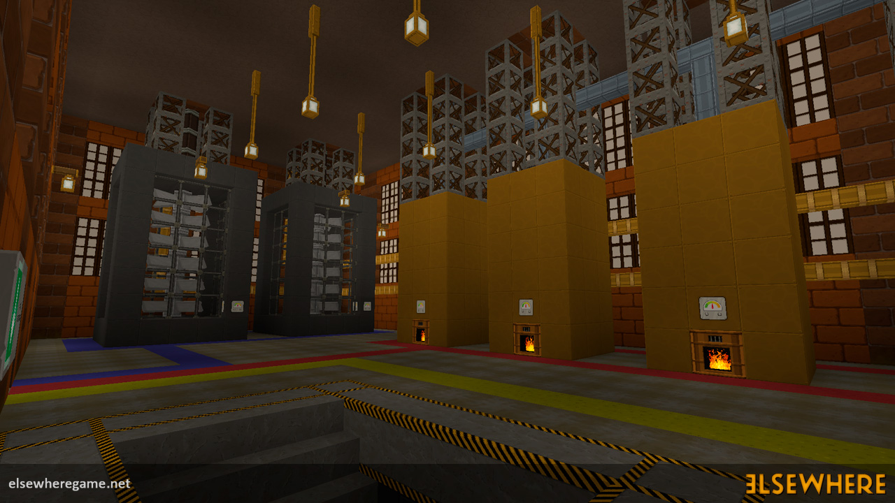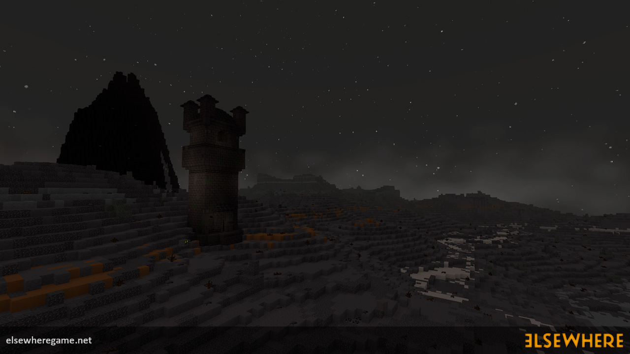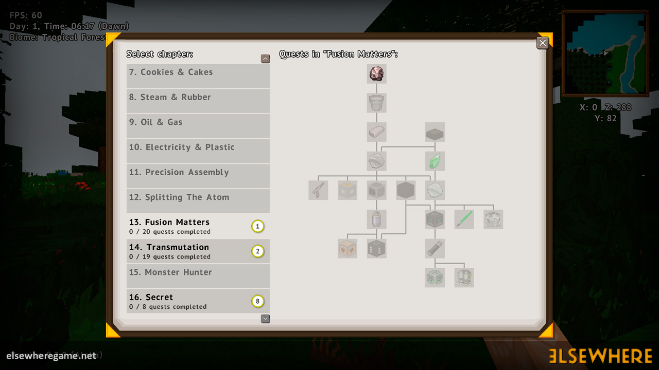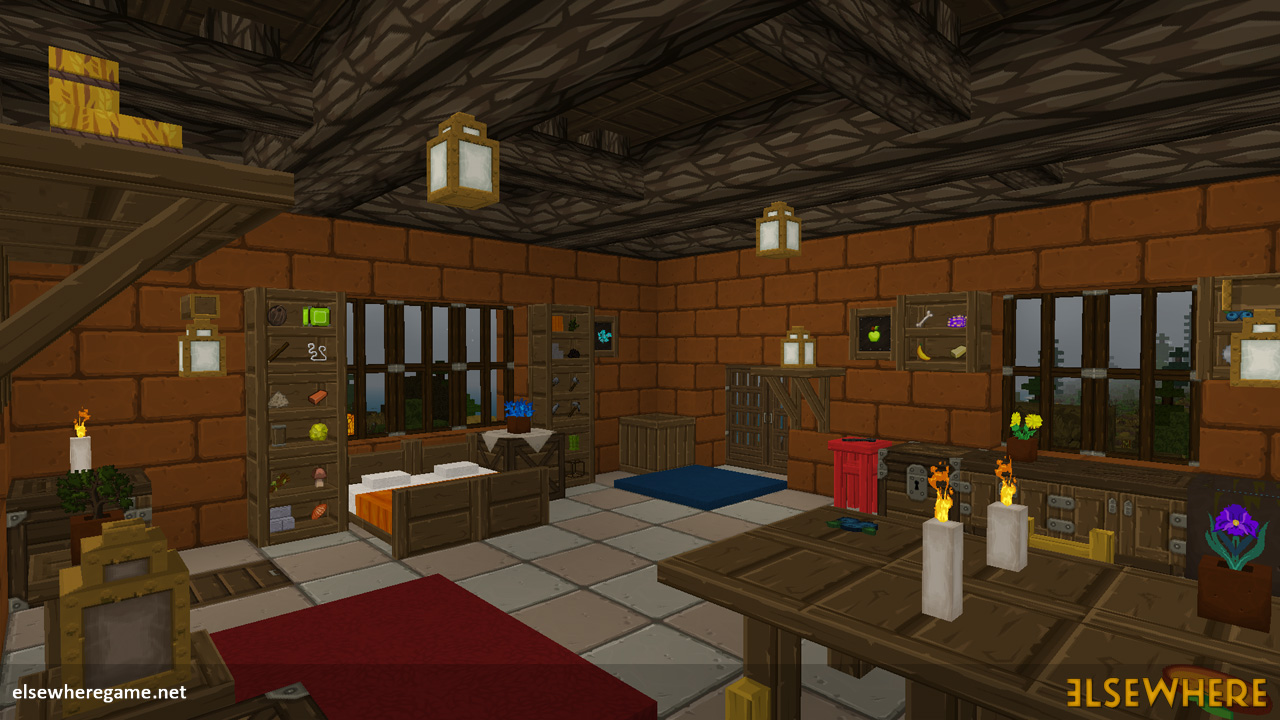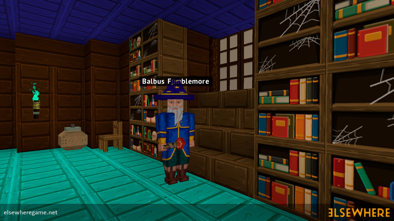 Elsewhere features a large procedurally generated and fully interactive world with dozens of biomes. Players can explore the world, place and remove blocks, build castles and machines, gather and process resources, farm, gather, and cook food, explore ancient ruins and temples, fight monsters, avoid traps, collect loot, and do many other things. There are over 8000 blocks, over 6500 recipes, and over 300 quests.