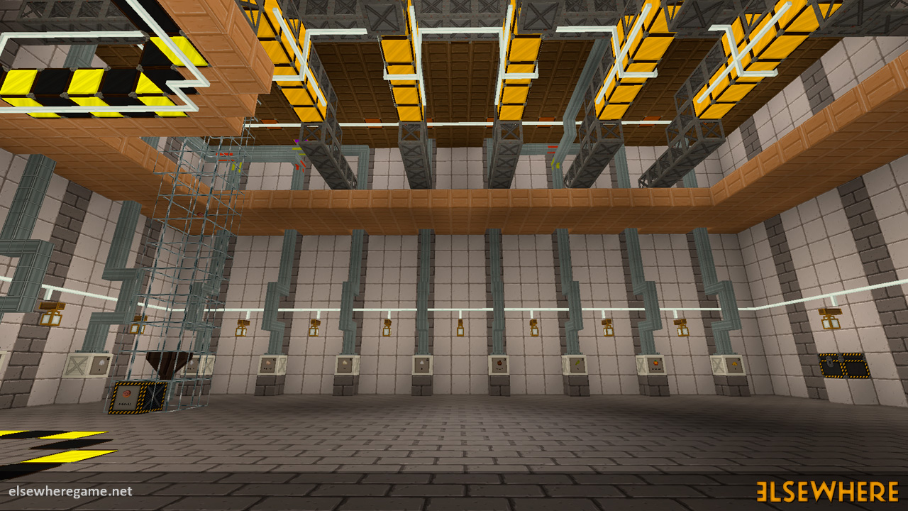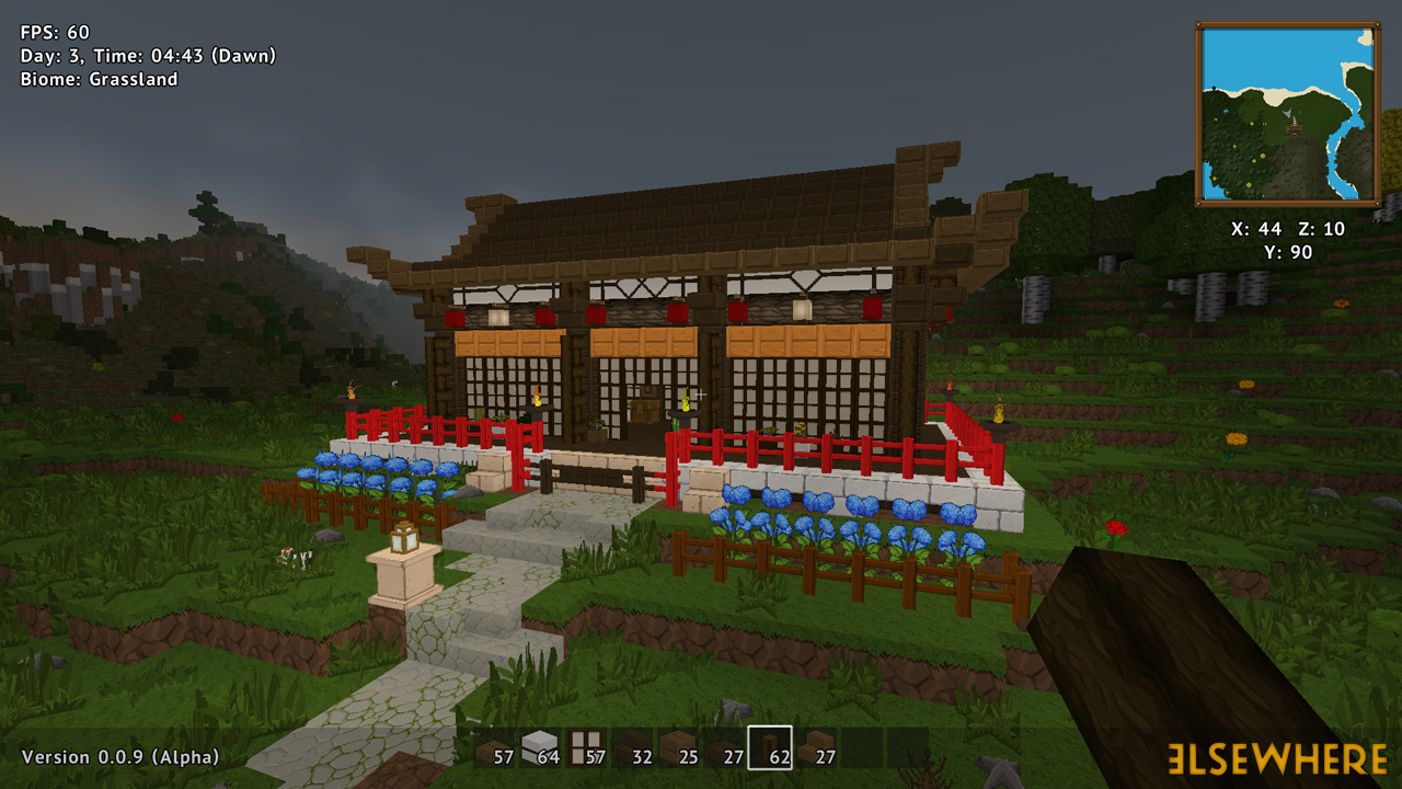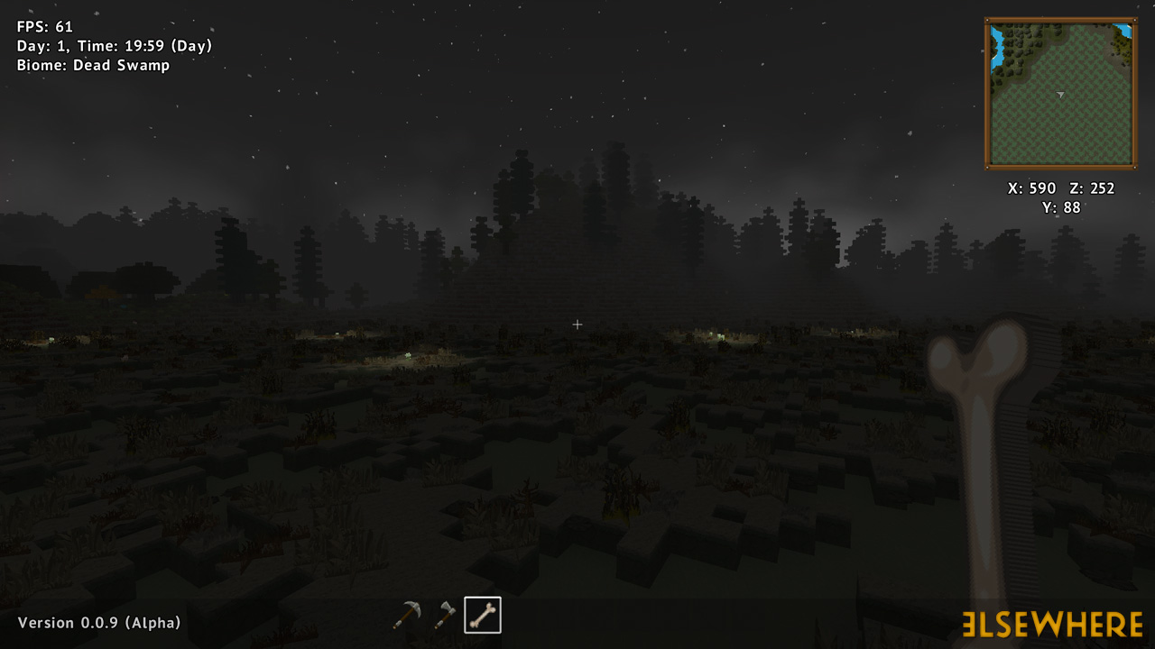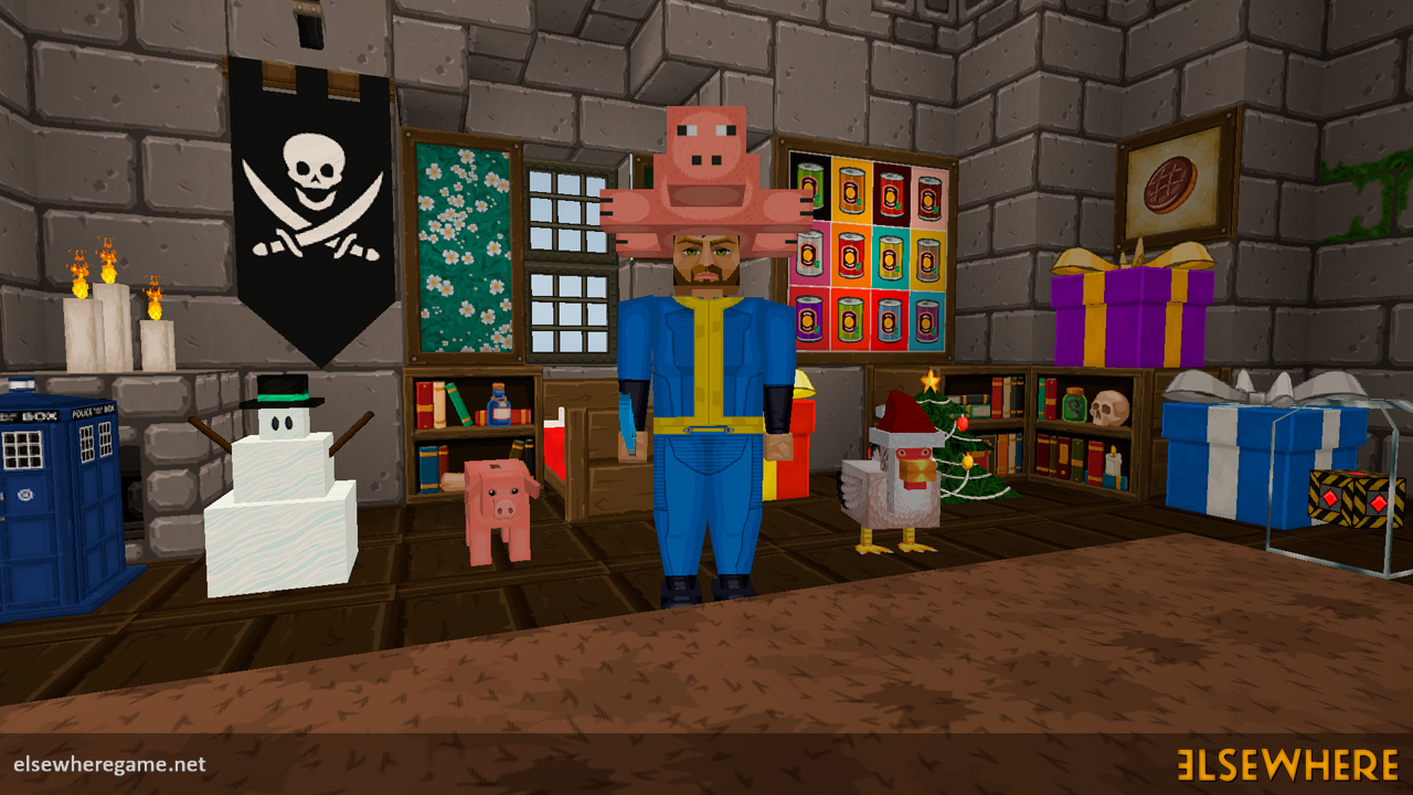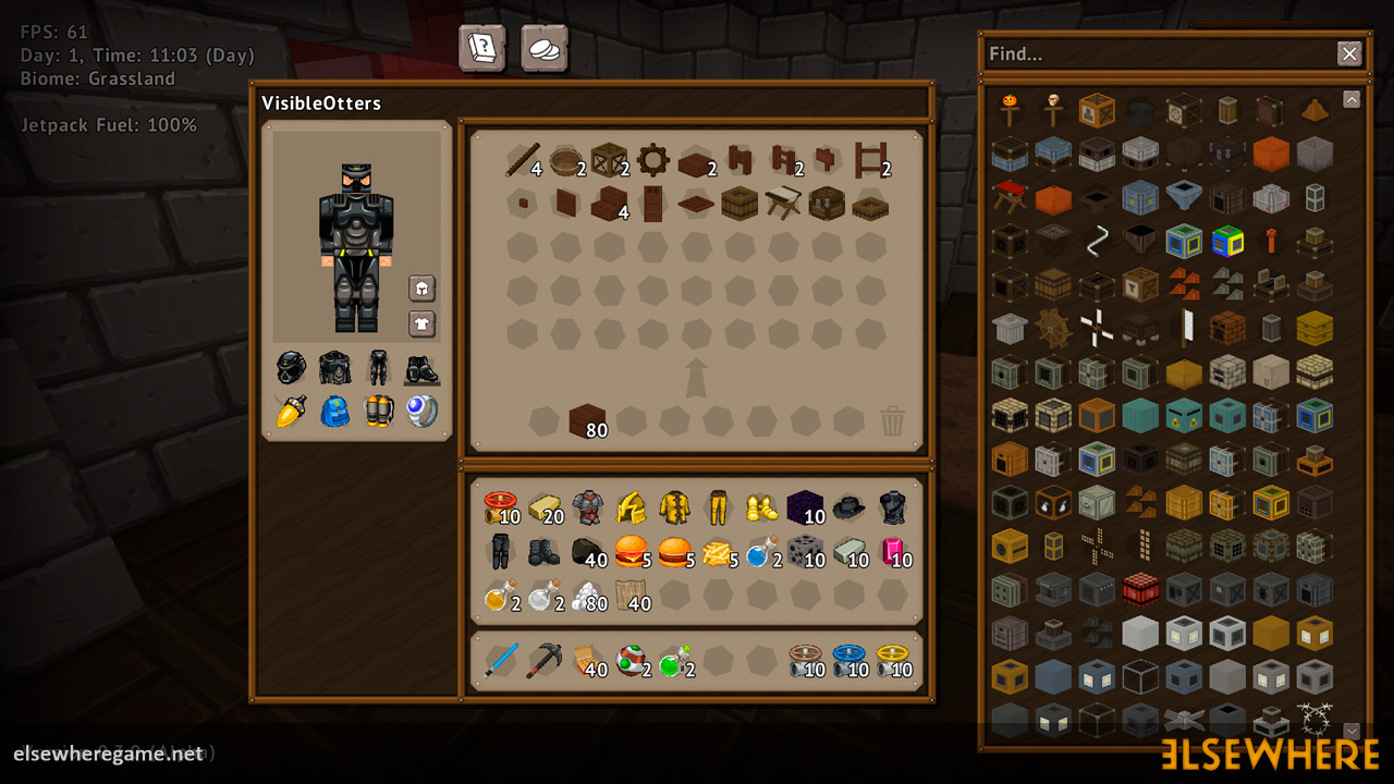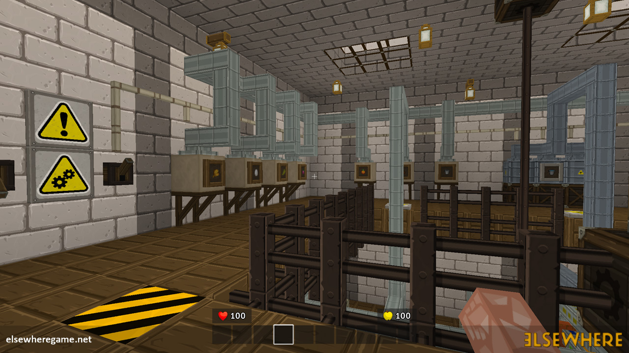 Elsewhere features a large procedurally generated and fully interactive world with dozens of biomes. Players can explore the world, place and remove blocks, build castles and machines, gather and process resources, farm, gather, and cook food, explore ancient ruins and temples, fight monsters, avoid traps, collect loot, and do many other things. There are over 8000 blocks, over 6500 recipes, and over 300 quests.